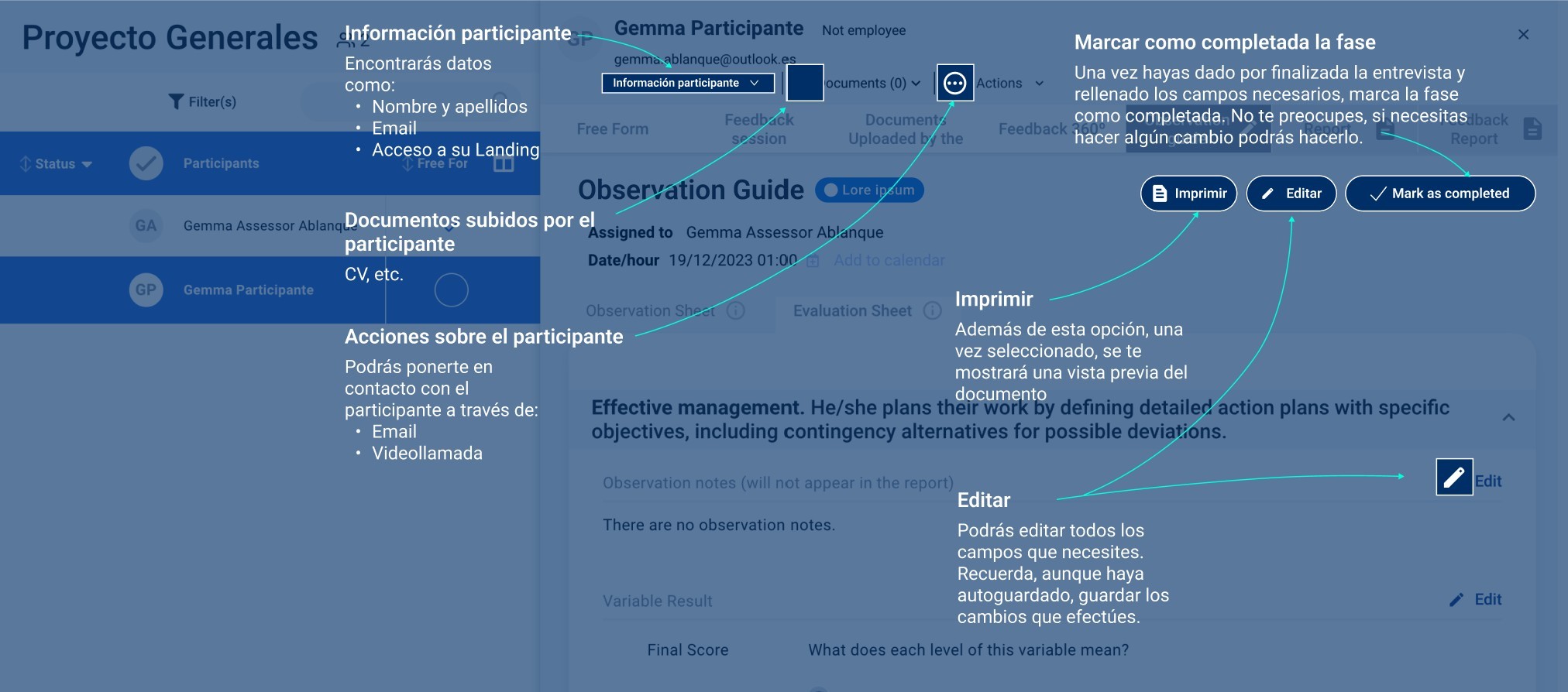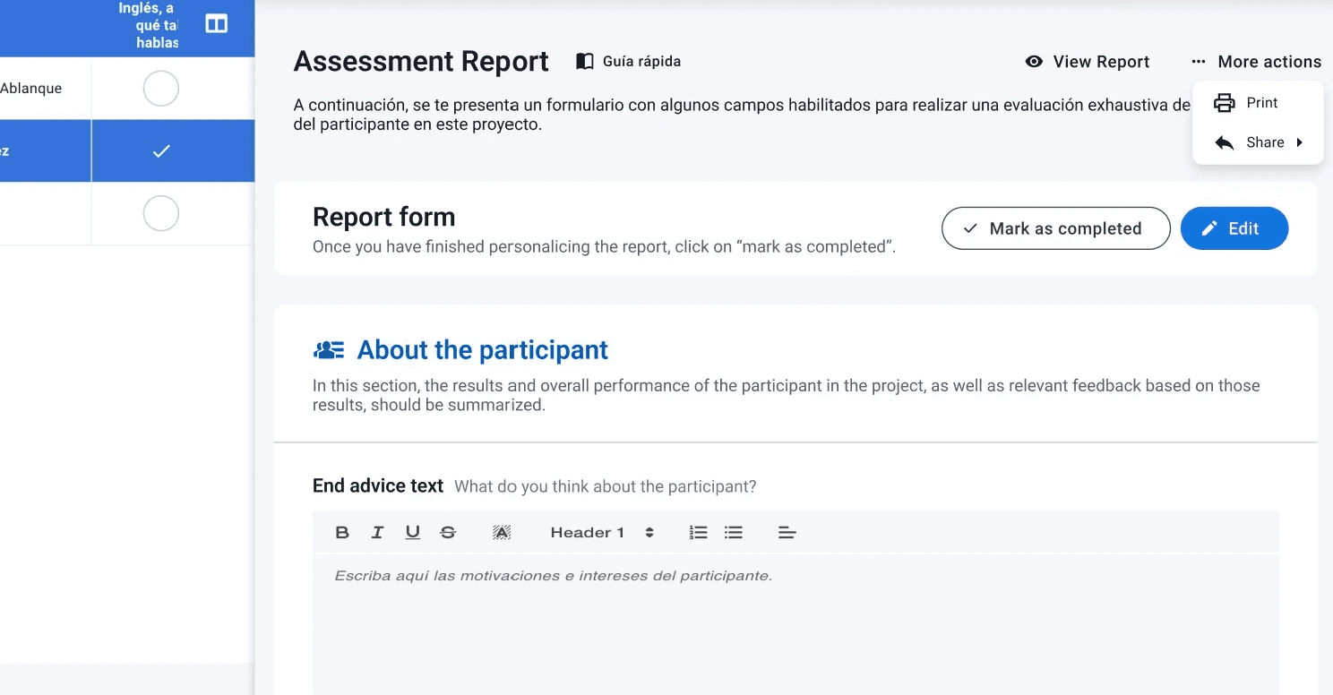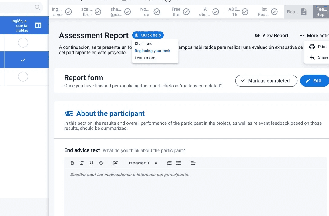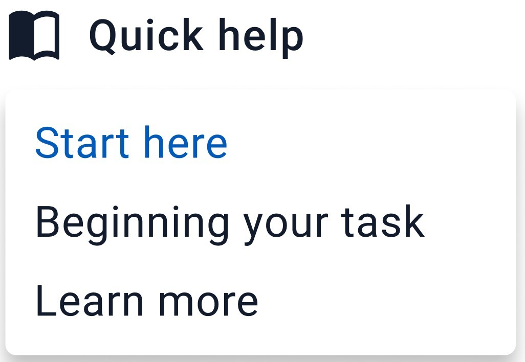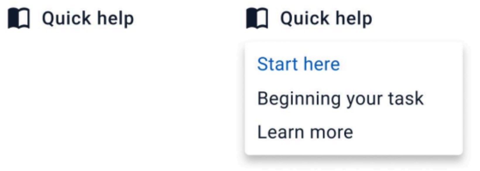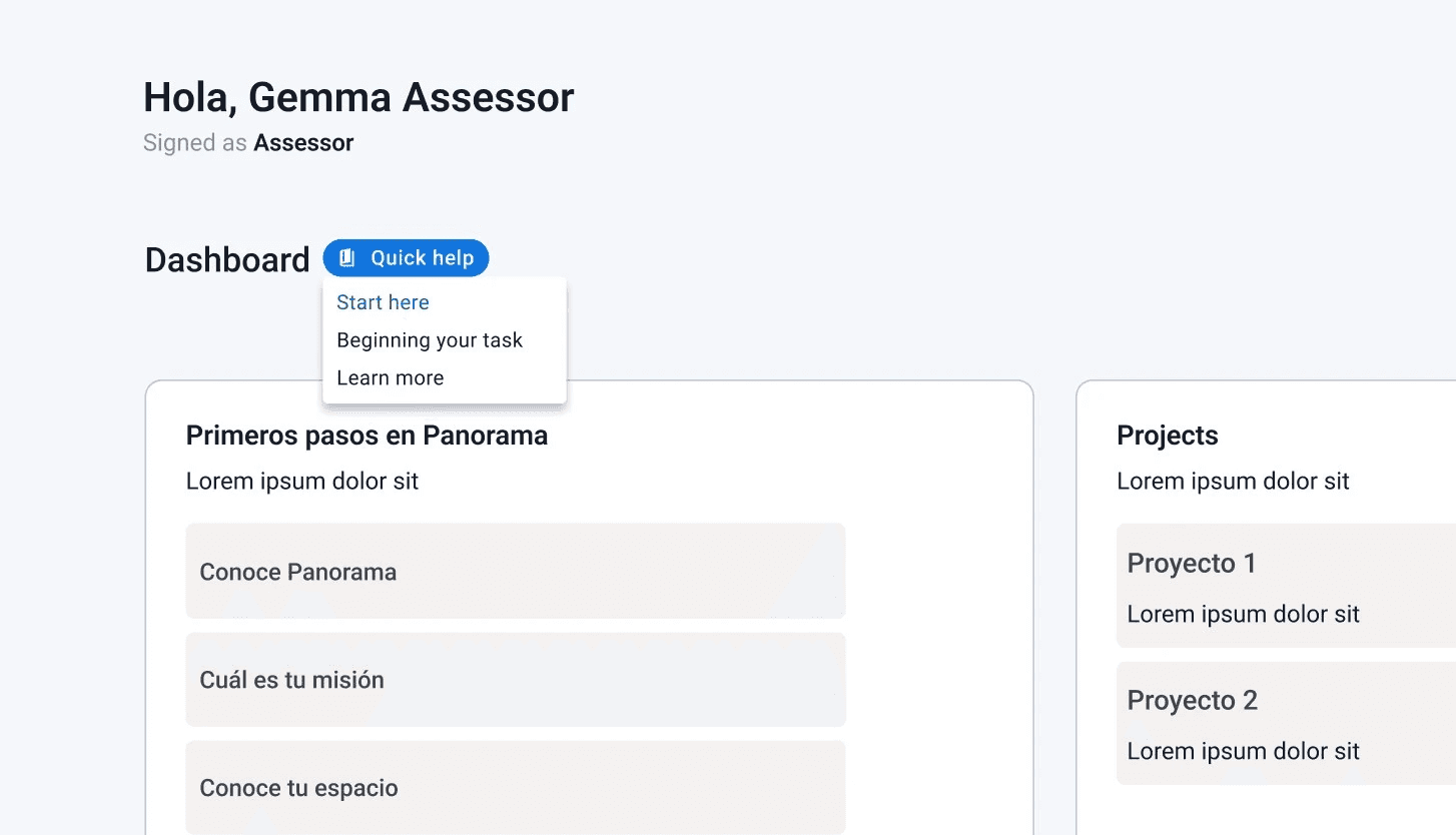 A contextual help dropdown button offers a simple and scalable way to guide assessors through the platform. It can provide quick visual onboarding to orient them within each screen, general information accessible at any time, and step‑by‑step guidance for completing tasks. This reduces the learning curve for new users while serving as a quick reference for experienced ones without interrupting their workflow.