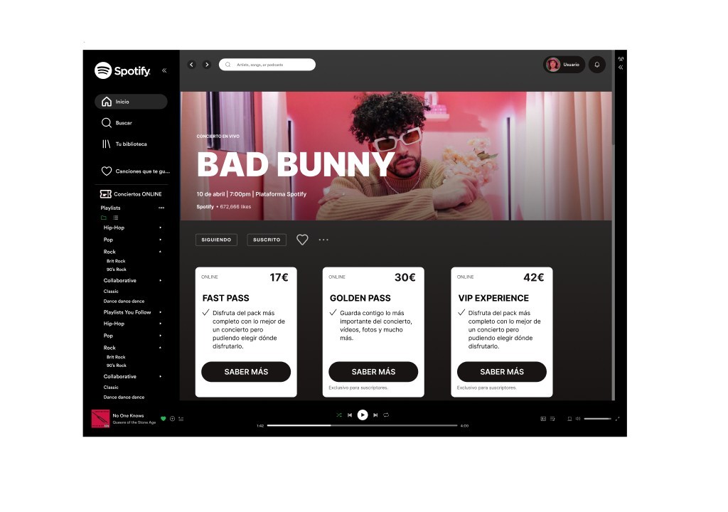 This project was developed during a professional workshop at Redbility, a leading product design agency in Spain. The challenge was to conceptualise and design a new feature for the Spotify mobile app: the ability to purchase and watch live-streamed concerts directly within the platform.